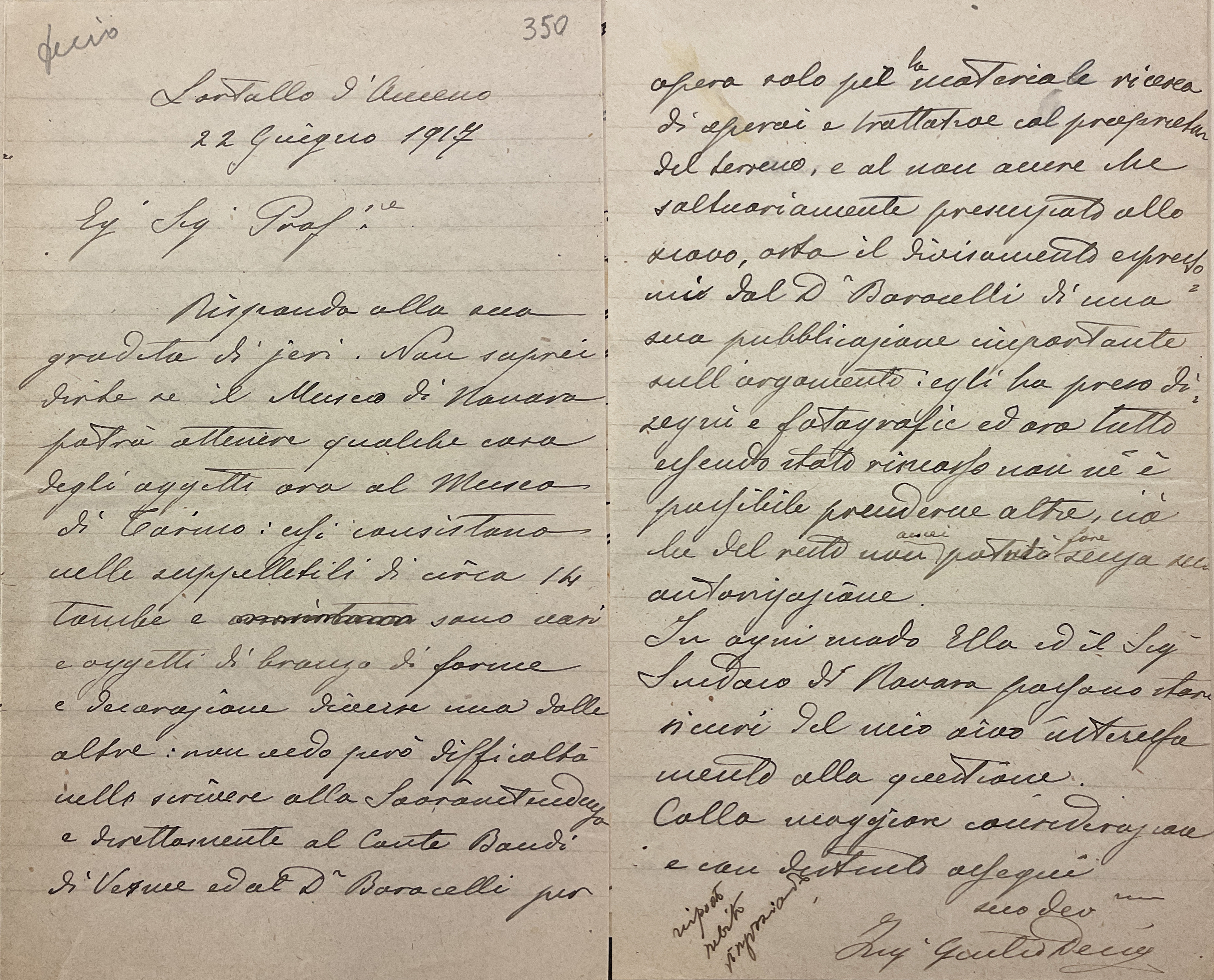 Dopo le prime indagini condotte direttamente da Barocelli, non solo Decio si occupò di portare avanti le ricerche, relazionando all’archeologo giornalmente a mezzo lettera, ma in più circostanze finanziò personalmente le ricerche, donando poi i materiali a lui spettanti per legge al Museo Civico di Novara.