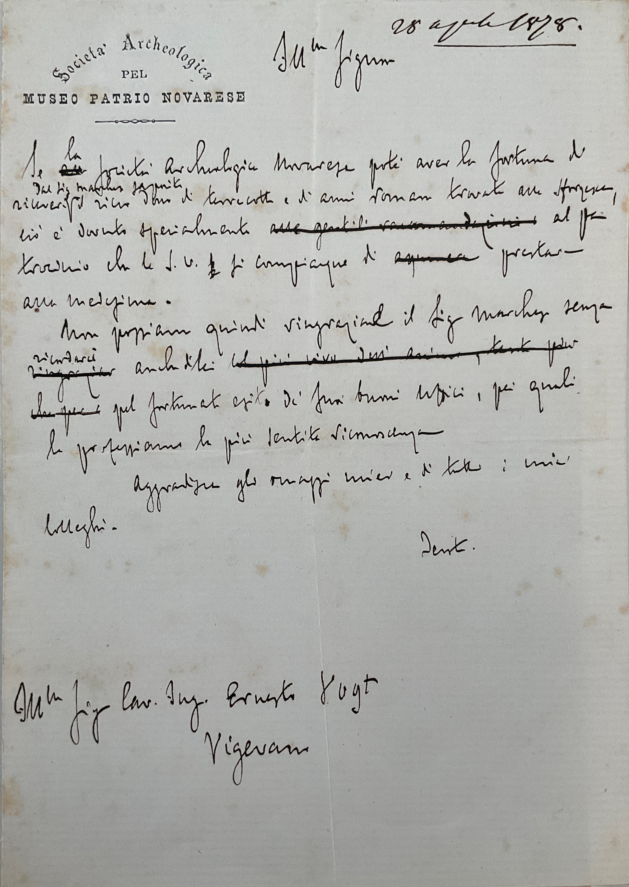 (Minuta di lettera di ringraziamento della Società Archeologica Novarese ad E. Vogt, 28 aprile 1878)