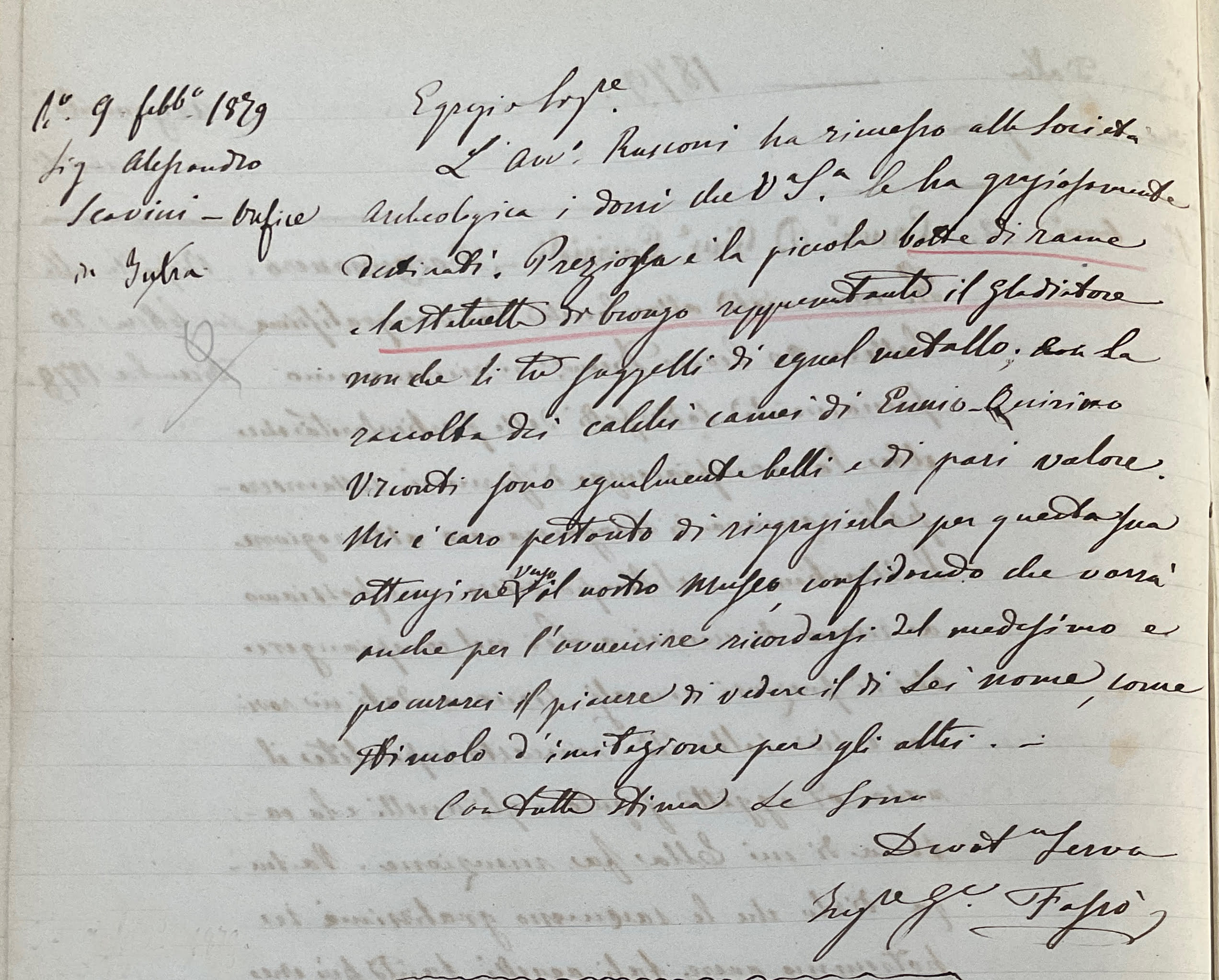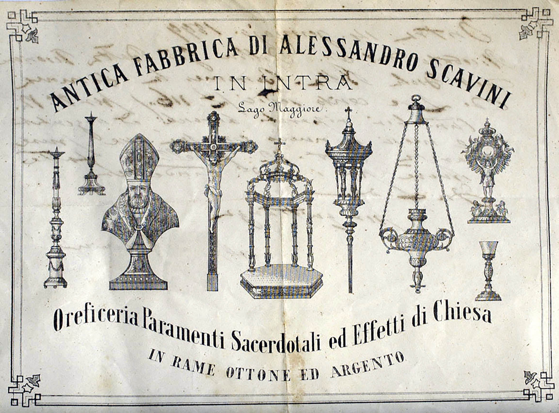 Nel febbraio 1879 il Registro doni della Società Archeologica annota una serie di oggetti provenienti da “Scavini Alessandro, orefice di Intra”. Si tratta di una bottiglia in lamina di rame, un bronzetto di Ercole con leonté e alcuni sigilli d’età medievale-moderna “tutti oggetti trovati in Ossola”. Come ultima voce del piccolo donativo sono registrati i “calchi in gesso dei camei di Ennio Quirino Visconti”. Lo stesso Scavini nel 1880 donò poi alcune ceramiche d’età romana in terra sigillata e pareti sottili, provenienti da Locarno, con ogni probabilità parte della vasta necropoli messa in luce negli anni attorno al 1874-76 in occasione della costruzione del Park Hotel della località lacustre svizzera.