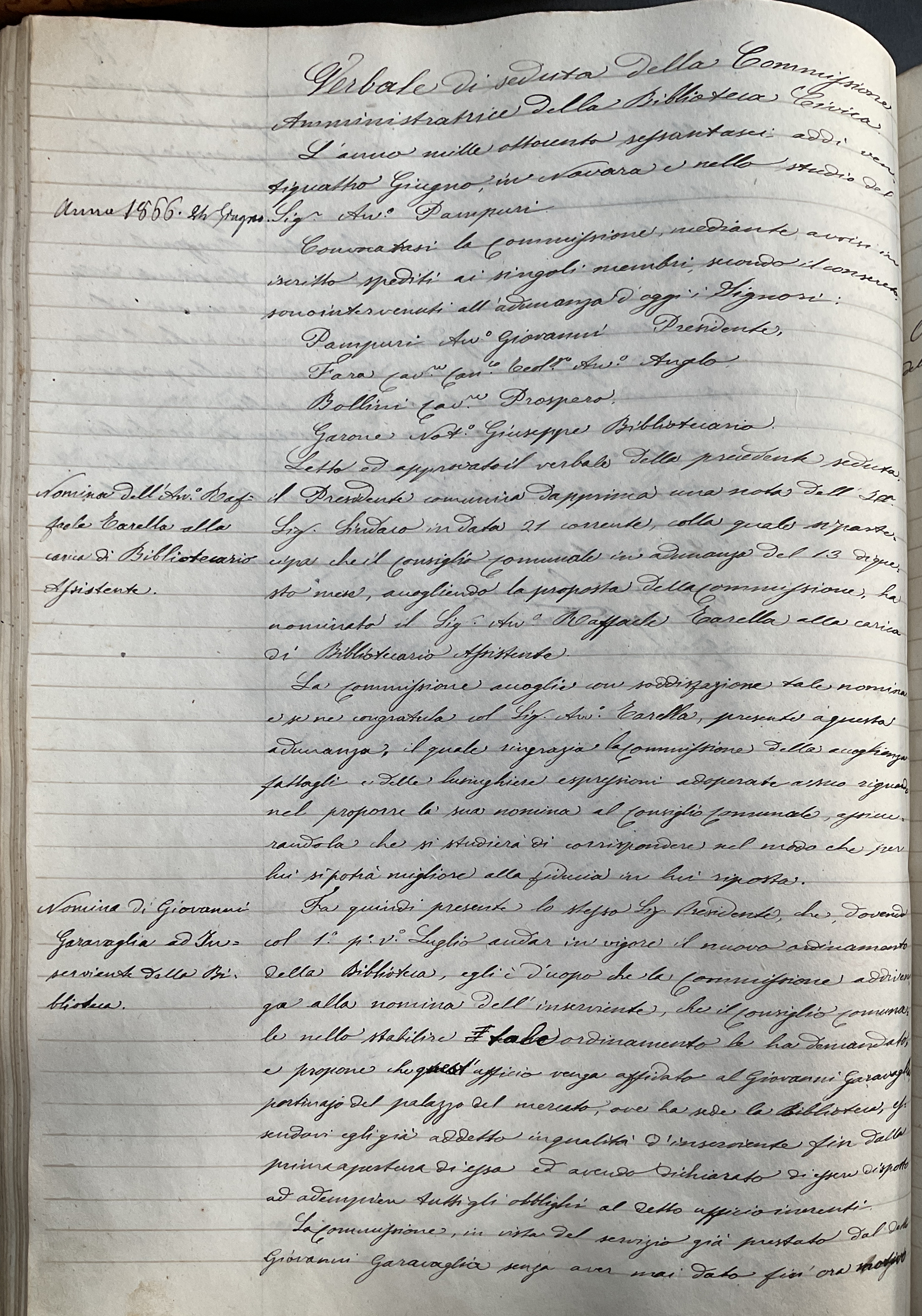 Il 24 giugno 1866, venne nominato “bibliotecario-assistente” della Biblioteca Civica, collocata presso il Palazzo del Mercato, della quale assunse poi la direzione. Di personalità timida e modesta, si dedicò alla crescita del patrimonio librario del comune di Novara, rendendo la biblioteca una delle più ricche della provincia, soprattutto attraverso l’acquisizione delle collezioni librarie di Prospero Bellini e Giovanni Carnaghi. Con lo scopo di attuare un fine lavoro di ricerca sulle memorie patrie, raccolse per la biblioteca numerose opere di autori novaresi e argomenti novaresi, oltre ad una collezione di statuti delle comunità della zona.