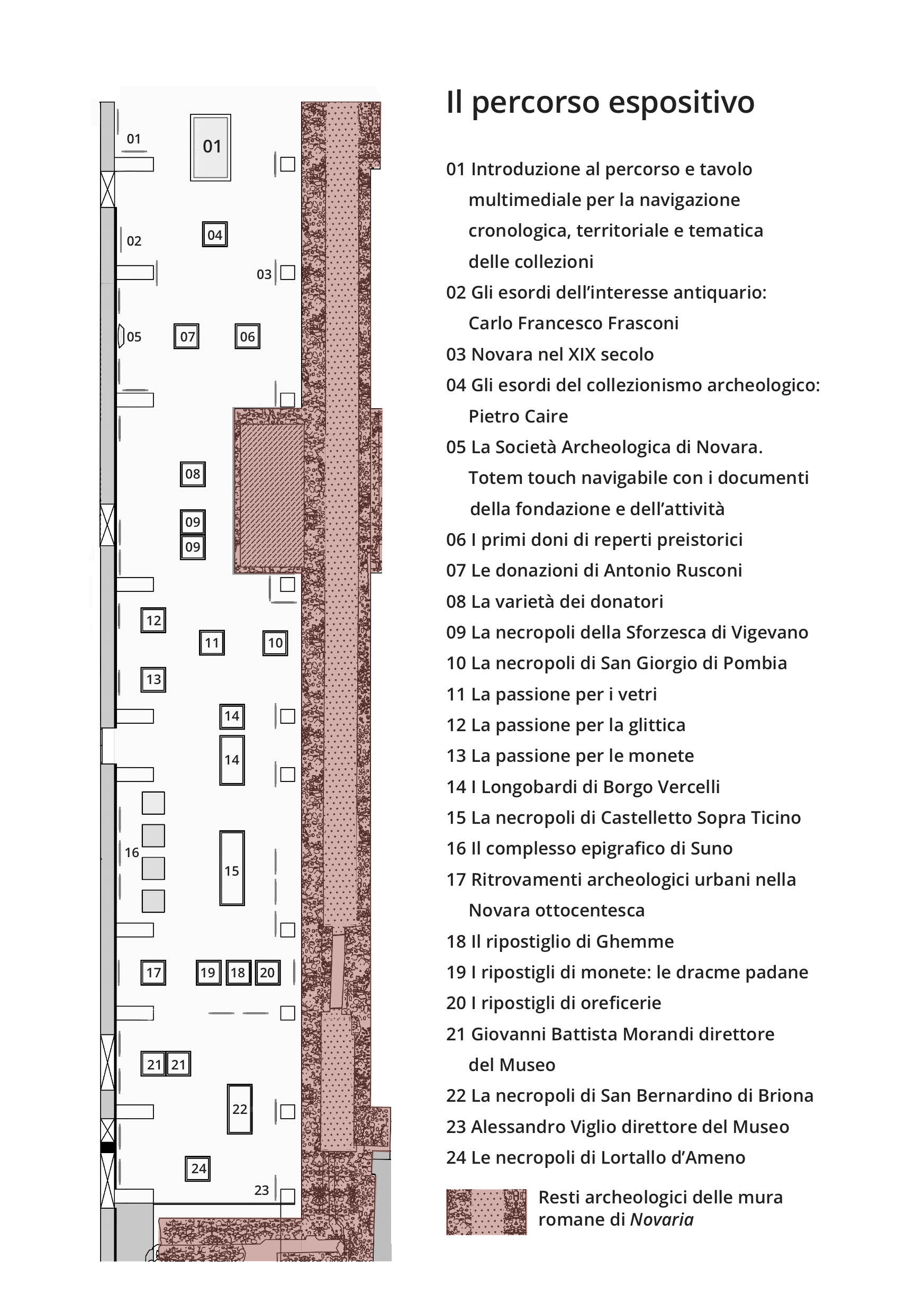 Il rinnovato Museo Archeologico di Novara è accolto nei sotterranei del Castello. In questa collocazione fortemente simbolica, poiché lungo il percorso museale è visibile una porzione delle mura romane della città su cui il Castello stesso fu costruito, i reperti vengono emblematicamente posti accanto a uno dei più significativi siti archeologici dell’antica Novaria.