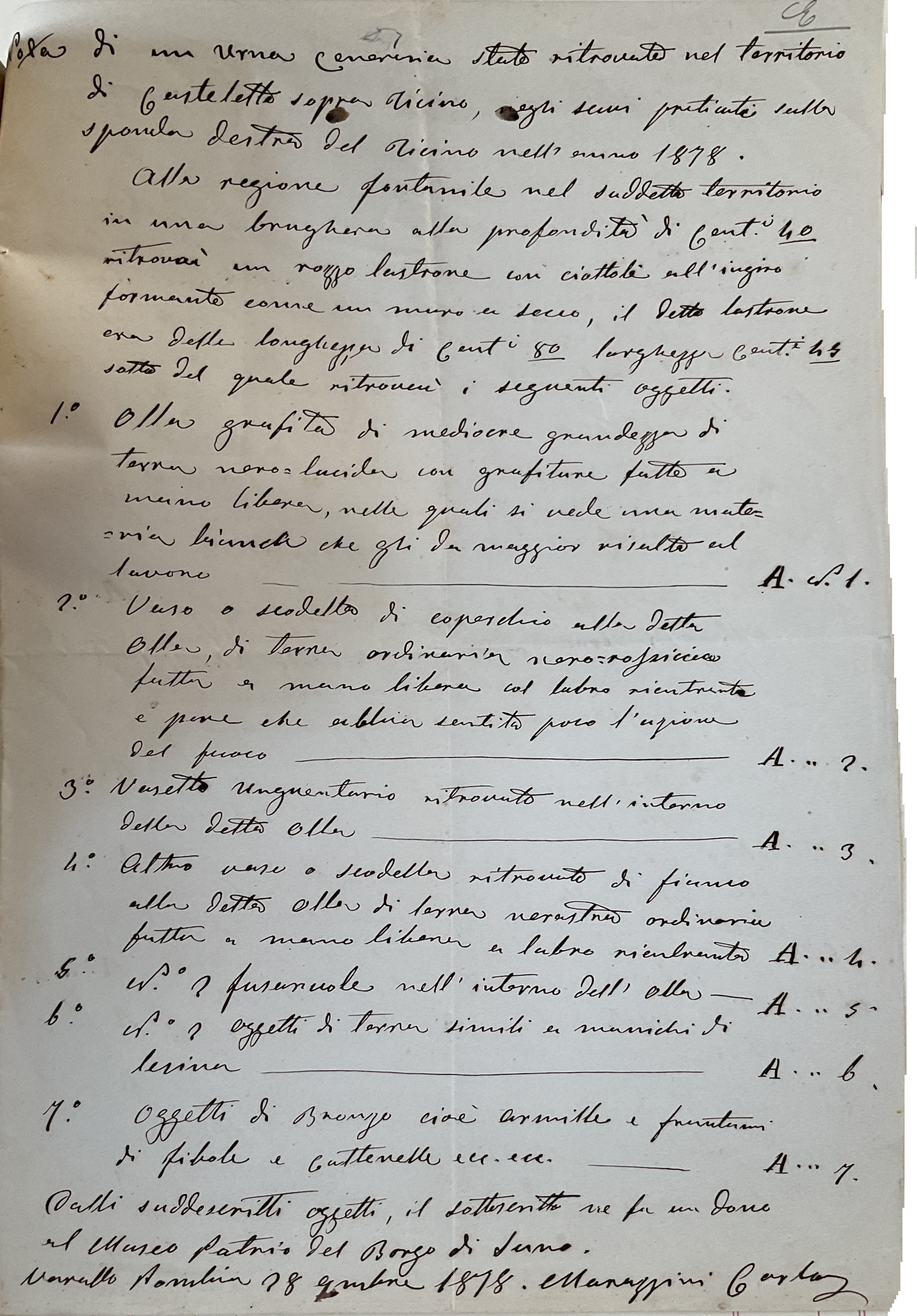 «Copiosissima e rara suppellettile archeologica, disposta su varii ordini di bancate addossate alle quattro pareti di un ampio salone, quale io stesso avevo ammirato alcuni anni prima della guerra, consistente in numerosissimi fittili, monete, armi, statuette, bronzi…»